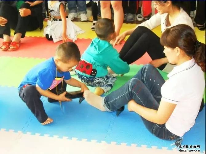 規(guī)則:爸爸雙手必須背后,媽媽必須將帶子系緊。