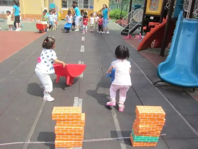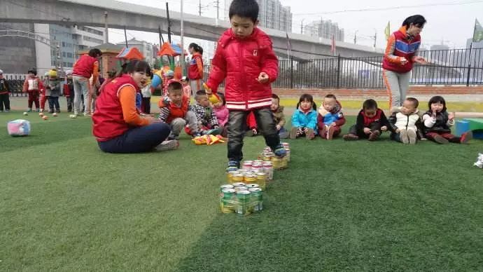玩法:家長從起點處將易拉罐運往終點,一次只可以運一只,幼兒在終點將運過來的易拉罐壘起來,一分鐘內壘得最高的獲勝。