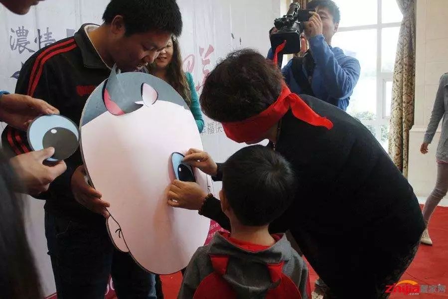 玩法:孩子與家長一組,兩組便可開始游戲。兩名家長分別背靠背被一條繩子套住,兩個幼兒分別站在家長對面的一條線后,游戲開始,每組家長使勁往自己孩子那一邊靠攏,當一方家長靠近自己孩子的線上時,孩子為家長臉上貼上貼畫,在規(guī)定時間內,哪位家長臉上的貼畫多,就為最后獲勝者。