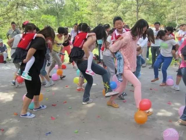 【80、吹吹跑跑 】 準(zhǔn)備:氣球80個 玩法:將幼兒和家長平均分成兩組,起點(diǎn)(幼兒)——終點(diǎn)(家長)。孩子手拿未吹的氣球跑向家長,家長接到氣球后開始吹,直到吹爆為止,才能背上幼兒跑回終點(diǎn),先完成的一組勝。